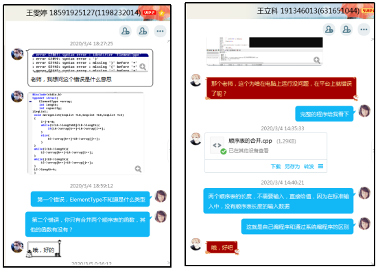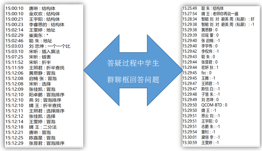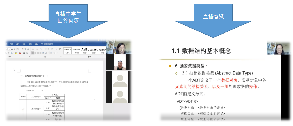 在“新冠肺炎”疫情这种特殊的环境下,线下的部分学习通过线上直播平台实现,数据结构课程采用“ZOOM”直播进行线上教学并指导答疑,这种直播方式可以同时打开教师端的视频和共享窗口,对于学习自觉性比较好,自控能力比较强的学生来说,跟线下教学方式没有什么区别。同时在教学过程中,随时可以通过“群聊框”进行讨论,以及了解学生当前知识点的掌握情况;随时可以通过“打开摄像头及麦克风”的方式进行提问,并检查学生当前问题的掌握情况,监督学生当前的学习状态以及学习结果。直播答疑过程截图如下: