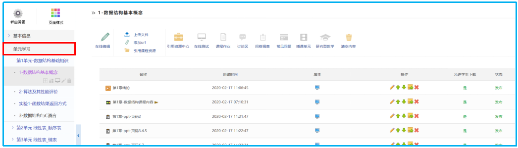 首先对教材内容进行课程单元划分,将数据结构课程内容分成16个课程单元,每周完成1个单元的教学任务。每周开展线上教学前,先进行单元教学设计,再依此完成相关工作:资源准备、资源上传、教学过程、测试、作业布置等。下面以第1单元为例,给出完整的课程单元设计。