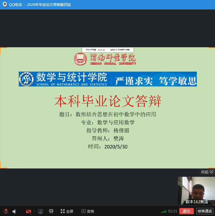 数学与统计学院于5月30日至6月10期间组织全院毕业生通过线上线下的方式分批分期进行毕业论文答辩,数学与应用数学、信息与计算科学、统计学3个专业共计170位同学参加了此次答辩。
