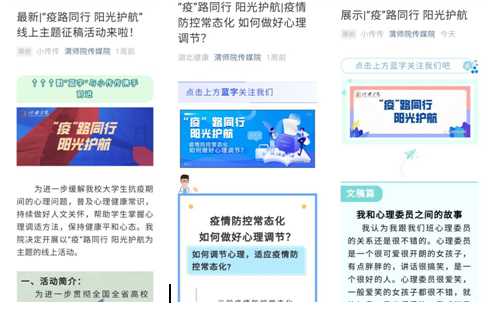 活动通过微信公众号、班级群等方式,积极做好宣传工作,并将优秀征文及视频作品在公众号进行展示。同时向广大师生分享疫情下如何保持心理健康相关内容。