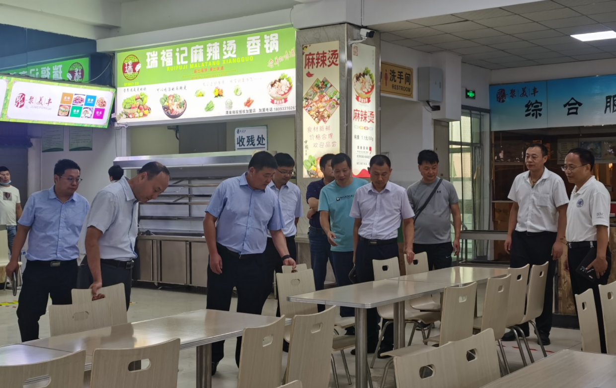 在学生餐厅,学校领导逐楼层检查开学开餐准备情况和疫情防控工作,仔细听取了关于餐厅疫情防控措施、管理服务人员准入、楼层分流设置、错峰用餐准备等情况的汇报,实地检查了卫生保洁、食品留样、库存物资等情况。