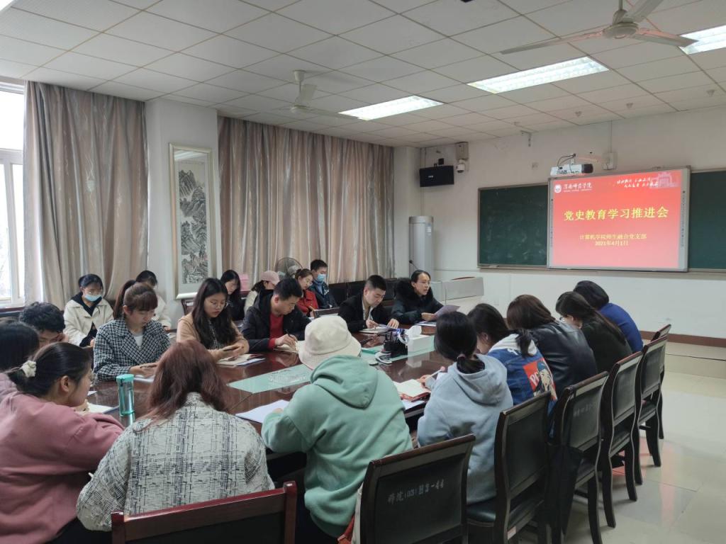 4月1日下午,计算机学院师生融合党支部组织召开党史学习教育推进会。学院党总支副书记武楠,师生融合党支部支部委员、全体学生党员参加,会议由师生融合党支部书记李雷玮主持。