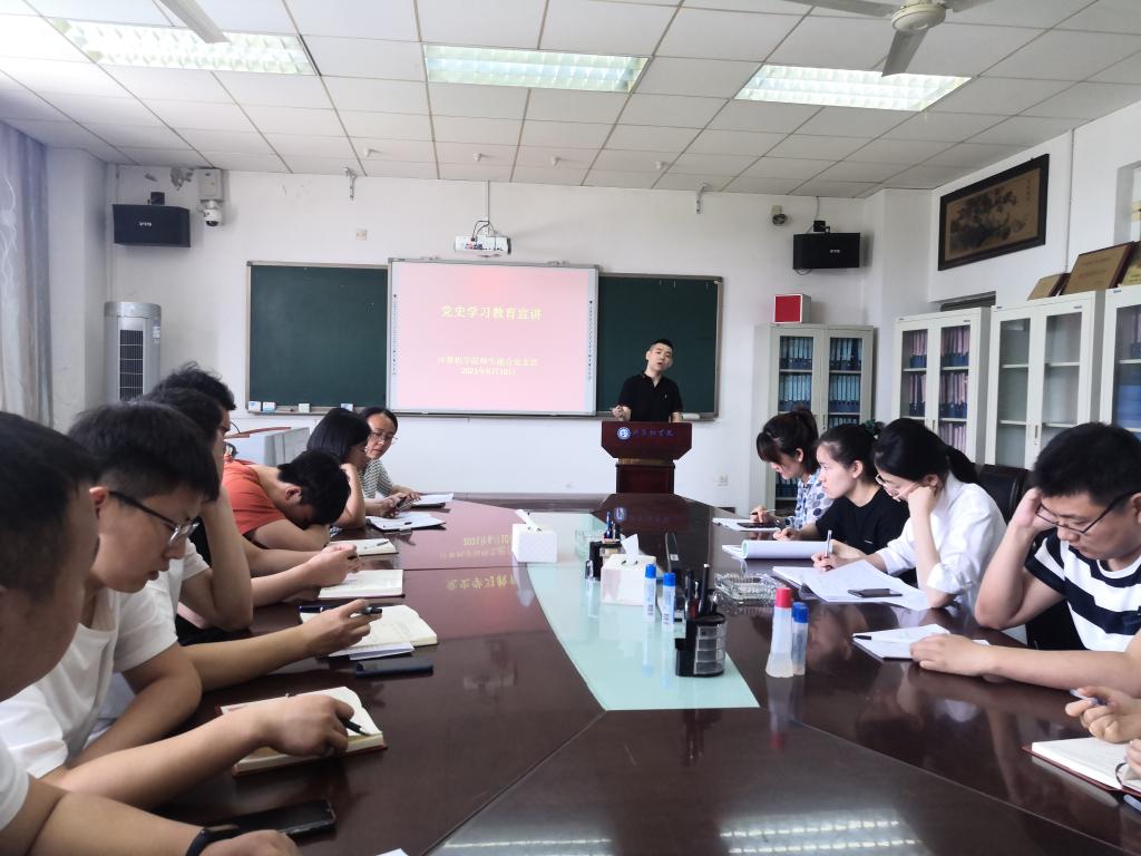 为庆祝中国共产党成立100周年,推进党史学习教育深入有序开展,引导全体学生党员深刻铭记中国共产党百年奋斗的光辉历程,传承好红色基因,弘扬好革命传统,汲取好奋进力量。6月10日下午,计算机学院师生融合党支部组织开展党史学习教育宣讲活动,支部书记李雷玮进行党史学习教育宣讲。学院党总支副书记武楠、党务秘书柳宏亚、全体专职辅导员及学生党员参会,会议由武楠主持。