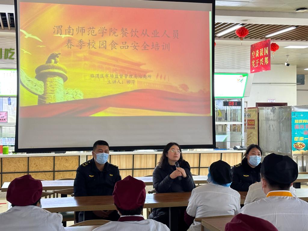 2月16日,后勤服务中心开展学生餐厅春季食品安全培训会。临渭区市场监督管理局站南所副所长任磊应邀参加。会议由后勤服务中心办公室主任、饮食管理科负责人安幼薇主持。