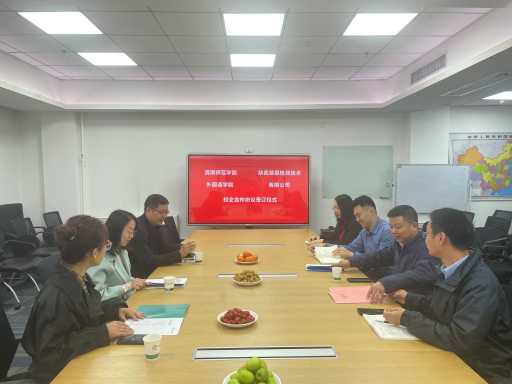 3月24日上午,外国语学院与陕西普恩检测技术有限公司校地合作签约仪式在陕西省西安市国家级民用航天基地众创广场举行。陕西普恩检测技术有限公司总经理张跃军、副总经理李鹏、我校科学研究处计划项目科科长杨春丽、外国语学院党总支副书记、副院长高军强、副院长李圣恩等人出席本次签约仪式。