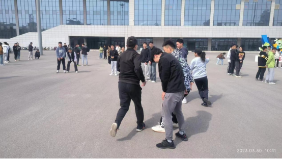 本次活动先以热身游戏“贴膏药”拉开了序幕,两人挨紧,面向圆心站立,10人为一组,场上一人为追者,另一人为逃者。追的时候,逃者可以跑到任何两个人旁边“贴膏药”,一旦贴住,贴住同学旁边的学员即变成为逃者,迅速闪避并引导出去追者。凡以手摸到被追者即为追上,此时追与被追者互换角色。此环节追者和逃者做着同样的动作,相互比划,相互追逐,大家忘却一切烦恼,在尽情的奔跑和欢呼中释放压力。