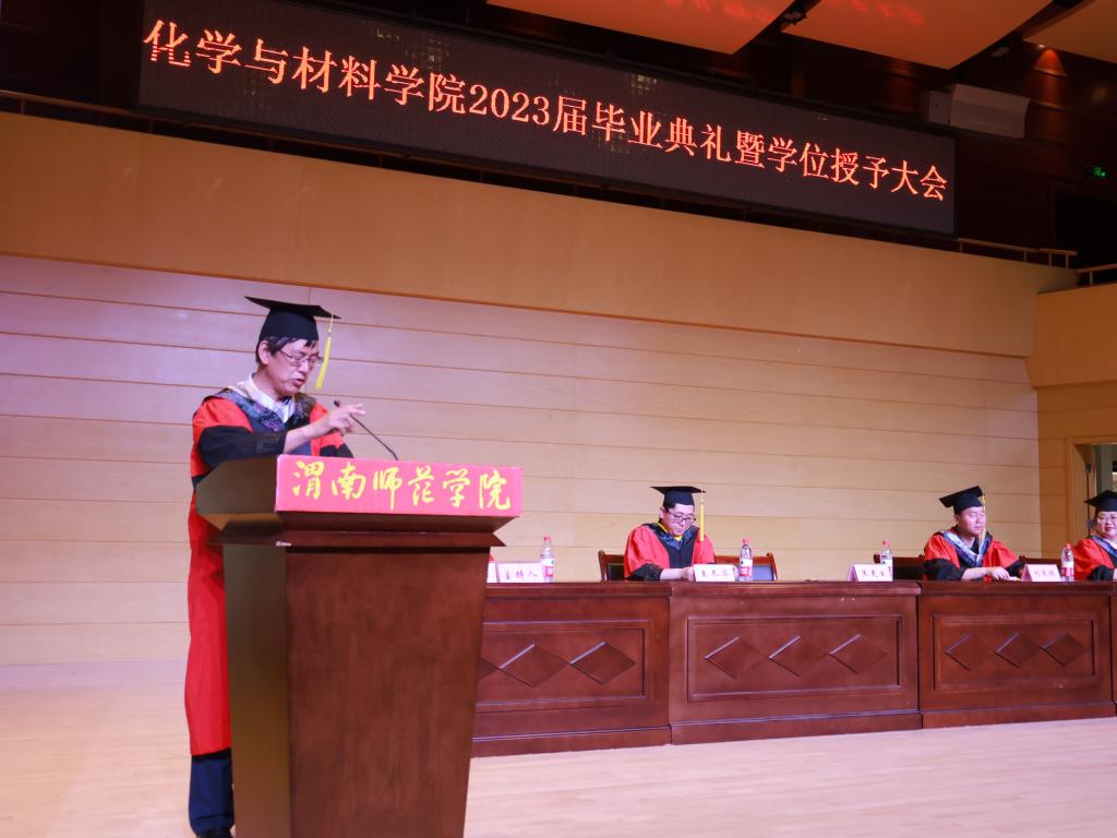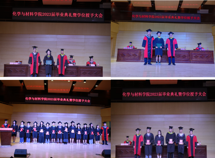 毕业典礼在雄壮的国歌声中拉开帷幕。副院长刘展晴宣读了2023届毕业生资格审核、学位授予资格审核结果文件,副院长王冬华宣读化学与材料学院关于表彰2023届考研学习标兵的决定,党总支副书记任晓婷宣读渭南师范学院关于表彰优秀毕业生、优秀学生干部的决定和渭南师范学院化学与材料学院关于表彰学生工作先进个人的决定。院领导为考研标兵、优秀毕业生、优秀学生干部、学院学生工作先进个人颁发了荣誉证书。