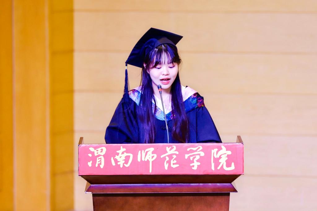 2019级戏剧影视文学专业1班杨淼同学作为毕业生代表发言,她分享了在大学四年里的成长点滴,表达了对母校、对老师的感恩和不舍,表示将带着母校的期望一路前行,成为母校引以为傲的人文学子。