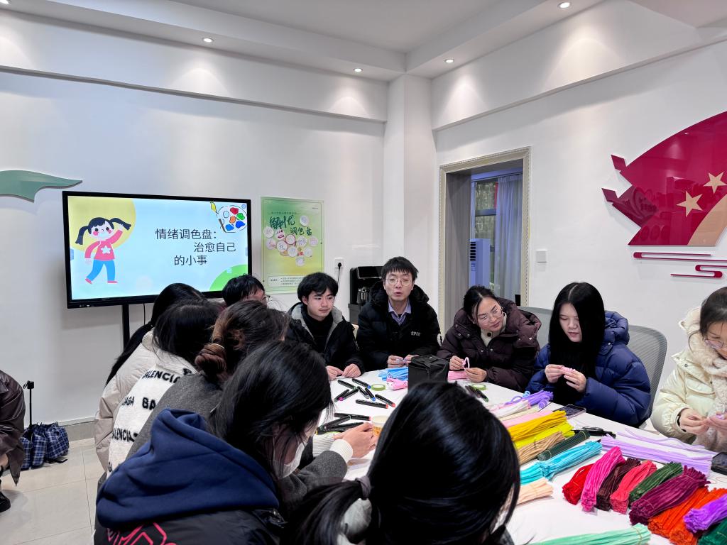 为了引导师生关注自身内心世界,舒缓学习与工作压力,12月12日下午,教育科学学院于学校“一站式”学生社区服务中心举办“润心竹梦”——“妙手生花,‘扭’转乾坤”·扭扭棒设计活动。本次活动分“解忧调色盘”“DIY扭扭棒创作”两个环节,同学们拿起画笔,在卡片上精心绘制出属于自己的“小时光”并分享;老师和同学们在舒缓的音乐声中充分发挥想象力和动手能力,面对五颜六色的扭扭棒,或独立构思,或团队协作,将一根根普通的扭扭棒变成了一件件精美的艺术品,同时相互分享与交流。此次“润心竹梦”——“妙手生花,‘扭’转乾坤”·扭扭棒设计活动,将心理健康教育与创意手工巧妙结合,以轻松愉悦的方式引导同学们关注内心世界,释放压力,收获快乐与成长。