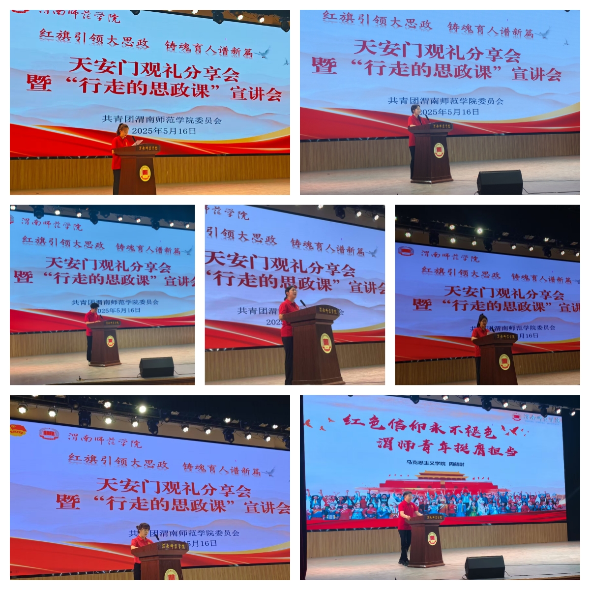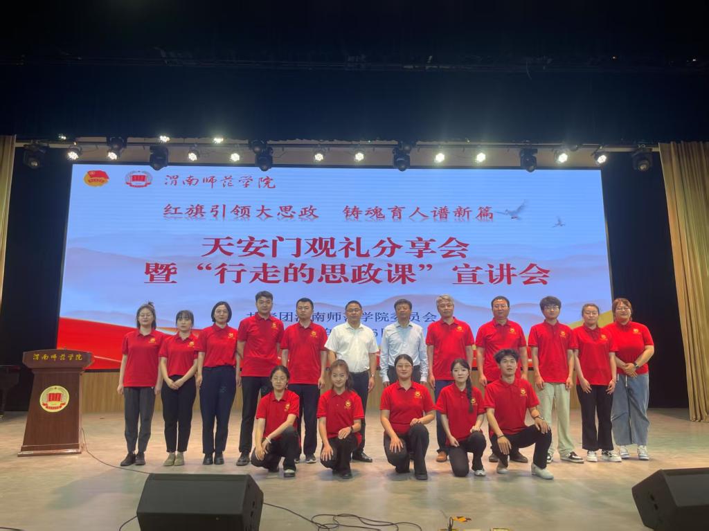 活动伊始,首先播放了我校师生登上天安门观礼台观礼的专题纪录短片。全程纪律严谨、精神饱满,满怀激动,统一穿着国旗红文化衫的渭师青年成为天安门观礼台一道亮丽的风景线。