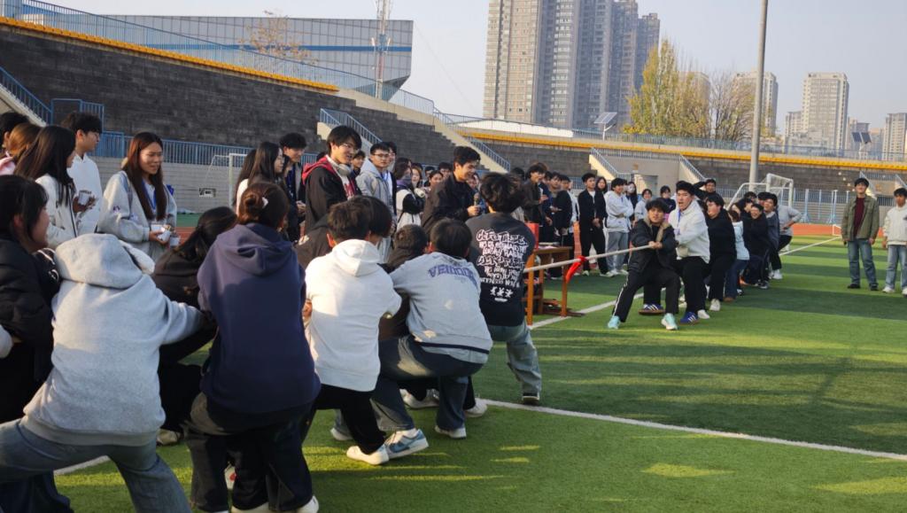 团体项目与个人游戏双线并行,将解压与育人深度融合。珠行千里考验精准协作,队员们手递槽管、眼随球动,每一次无缝衔接都是团队默契的生动诠释;“同心击鼓”彰显协同智慧,环绕鼓身的学子们同步发力,让彩球在鼓面跃动出团结的节奏;“车轮滚滚”“摸石过河”“同舟共济”等项目则以沉浸式体验,让学子在突破挑战中领悟“人心齐,泰山移”的深刻内涵。作为友谊互动的拔河项目更成为全场焦点,7男5女组成的参与队伍紧握绳索、奋力后拉,呐喊声与助威声交织成青春奋进的乐章,充分展现物电学子的凝聚力与向心力。