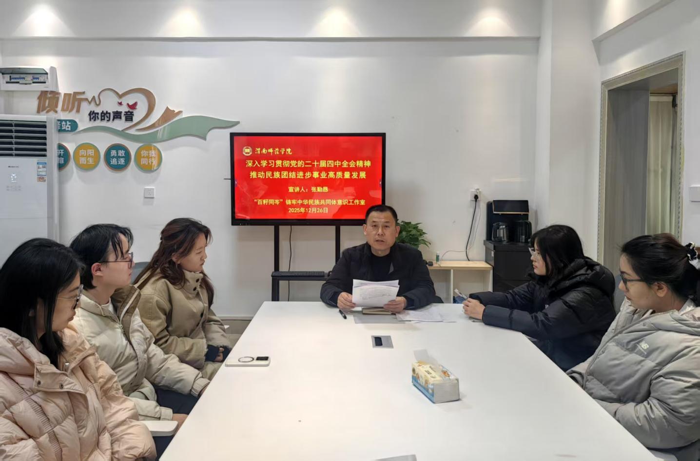 12月26日,经济与管理学院“百籽同岑”铸牢中华民族共同体意识工作室邀请校党委委员、统战部部长张勤恳在“一站式”学生社区为各民族师生代表宣讲党的二十届四中全会精神。