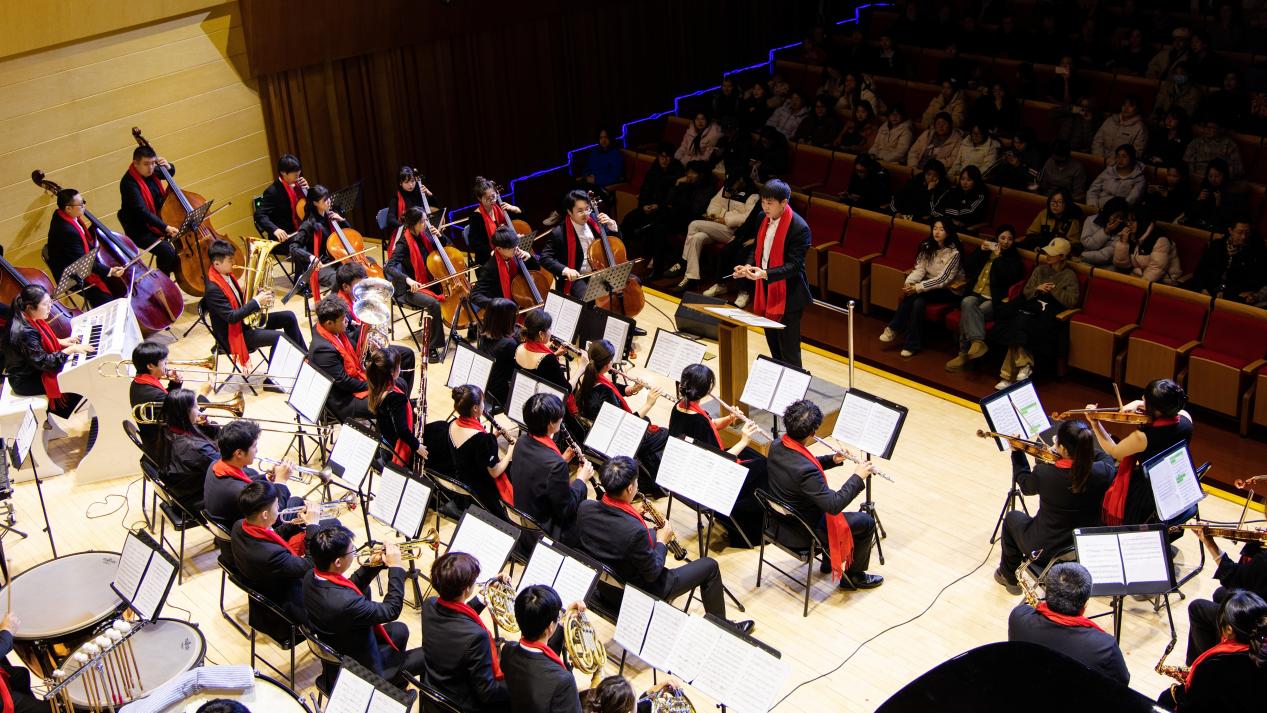 作为陕西省艺术团分团,渭南师范学院合唱团先后呈现《将进酒》《别君叹》及《长征组歌》选段,情感真挚、气势恢宏。交响乐团在常任指挥傅楚童执棒下,奏响《关峡第一交响序曲》《钢铁洪流进行曲》等作品,展现师生昂扬风貌。整场音乐会在全体齐唱《歌唱祖国》中达到高潮,激昂旋律抒发渭师人对祖国的热爱与对新时代的礼赞。