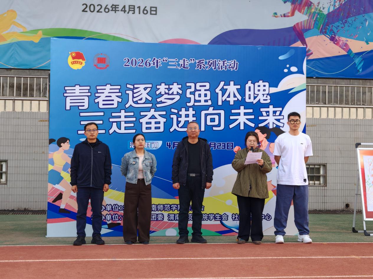 4月22日下午,2026年“走下网络、走出宿舍、走向操场”三走系列活动启动仪式于朝阳校区田径场顺利举行。学校团委书记赵琦、党委学生工作部副部长刘原、教务部副部长侯永广、体育学院团委负责人苟南琨及各学院学生代表齐聚现场,共同拉开活动帷幕。